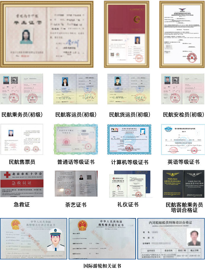 可根據(jù)所學(xué)專業(yè),參加相關(guān)部門或行業(yè)組織的考試,成績合格,可取得相應(yīng)的職業(yè)資格證書。如:公共英語三級、普通話等級證書、安檢證書、民航客運(yùn)證書、急救證、禮儀證書、茶藝證書、民航客艙乘務(wù)員培訓(xùn)合格證、船員基本安全培訓(xùn)合格證、船舶保安意識培訓(xùn)合格證、國際航行船舶船員專業(yè)英語考試合格證明、客船船員特殊培訓(xùn)合格證等。