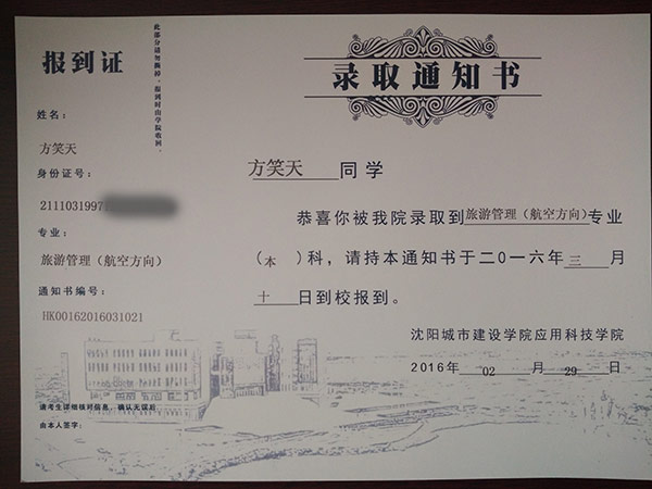 恭喜方笑天同學被我校錄取【沈城建航空】