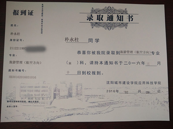 恭喜樸永柱同學(xué)被我校錄取【沈城建航空】