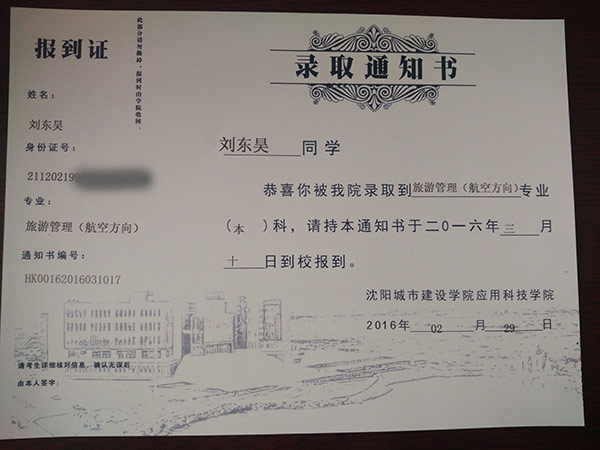恭喜劉東昊同學(xué)被我校錄取【沈城建航空】