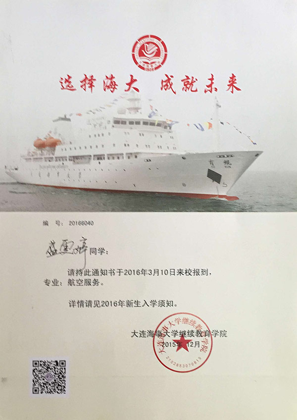 恭喜盛雯婷同學(xué)被我校錄取【大連海事大學(xué)航空】