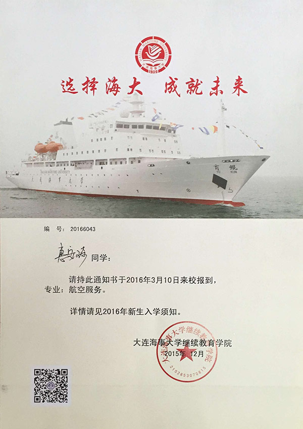 恭喜惠安琦同學被我校錄取【大連海事大學航空】