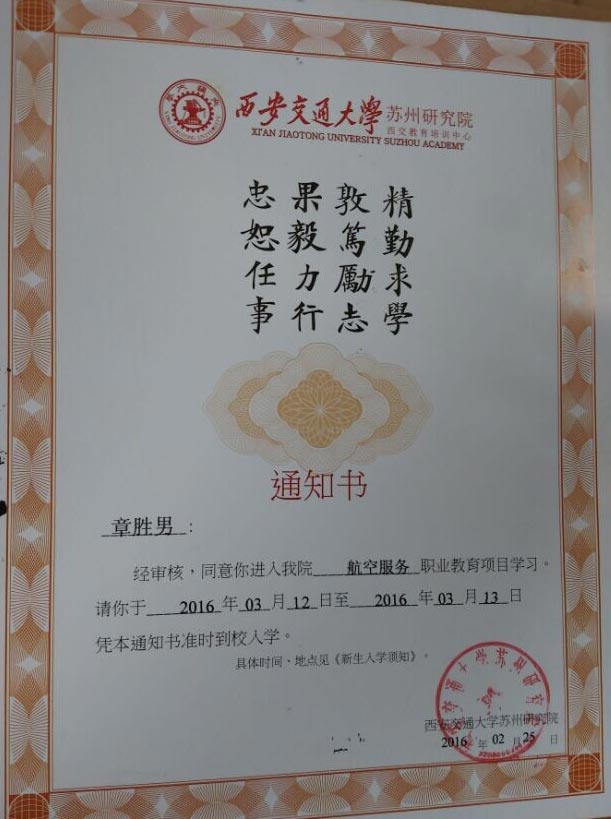 恭喜章勝男同學(xué)被我校錄取【西交大蘇州航空】