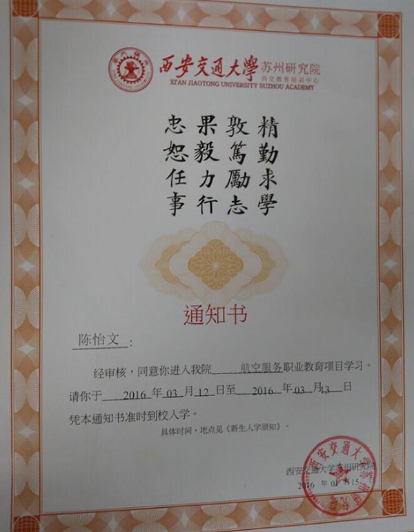 恭喜陳怡文同學(xué)被我校錄取【西交大蘇州航空】