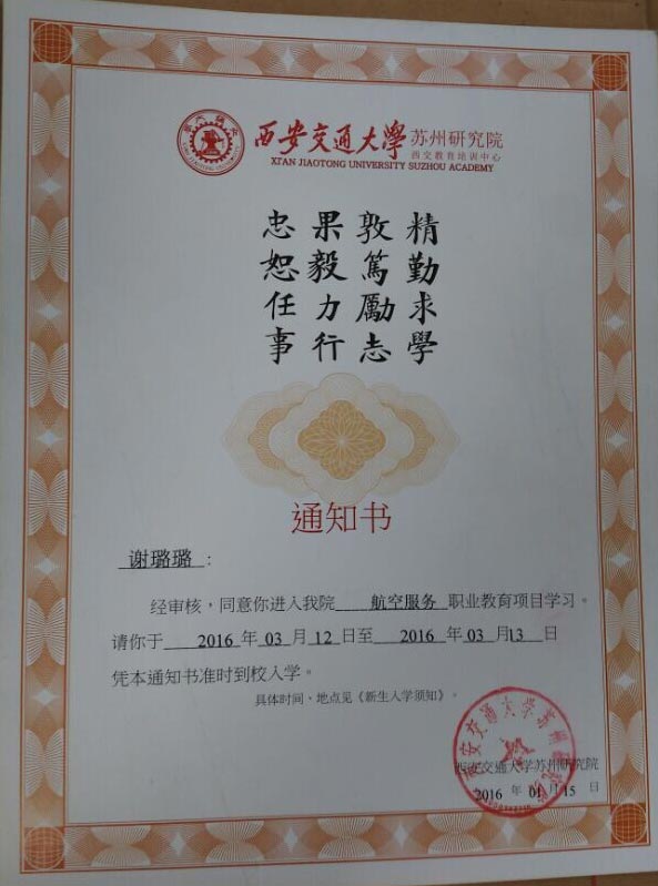 恭喜謝璐璐同學(xué)被我校錄取【西交大蘇州航空】