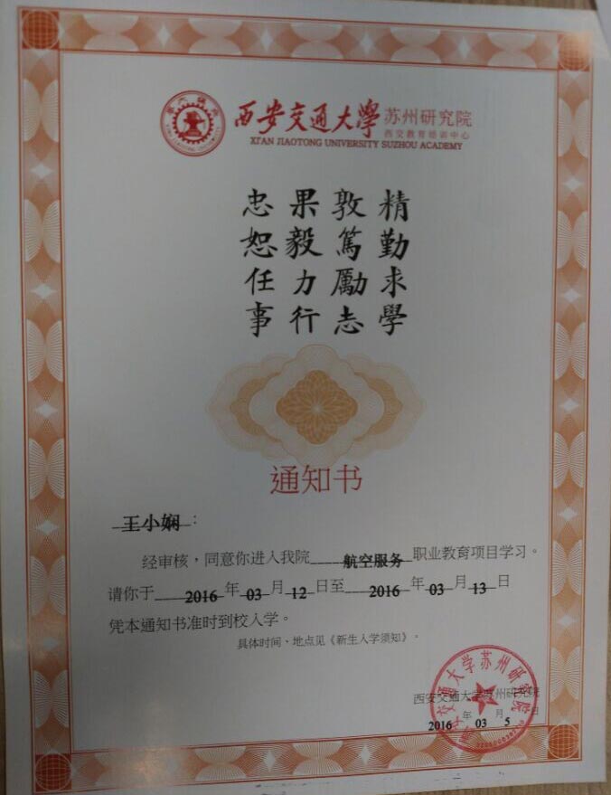 恭喜王小嫻同學(xué)被我校錄取【西交大蘇州航空】