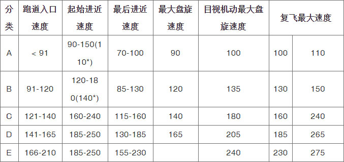 注解:跑道入口速度:設定為航空器在最大允許著陸重量時,著陸狀態(tài)中失速速度的1.3倍;*表示反向和直角程序的最大速度。