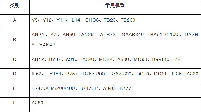 根據(jù)ICAO按航空器幾何尺寸進行分類的規(guī)定,我國常見民用航空器的分類見下圖