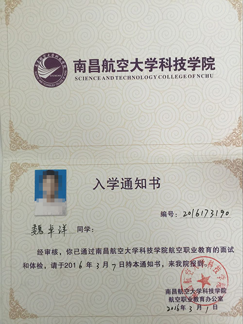 恭喜魏卓洋同學(xué)被我校錄取【南航航空】