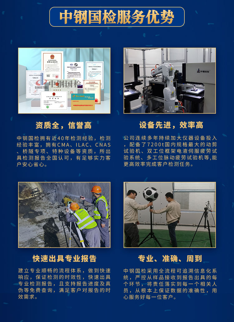 中鋼國檢,專注做檢測三十余年,在原材料檢測及工程項目檢測方面有很多成熟的經驗,出具的檢測報告全國認可。